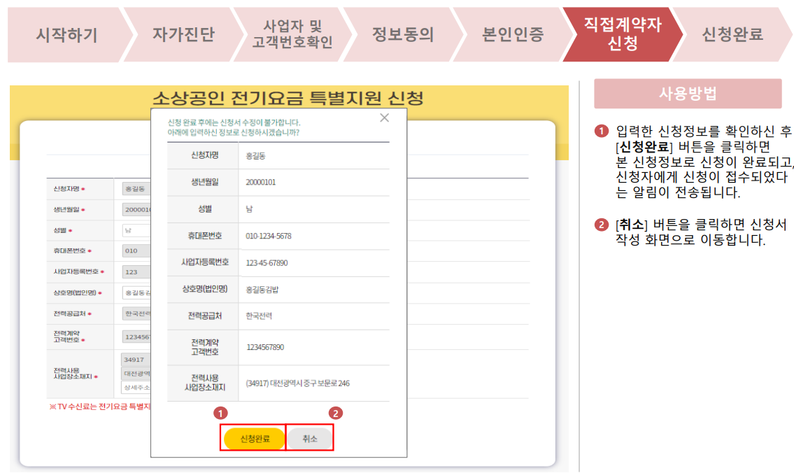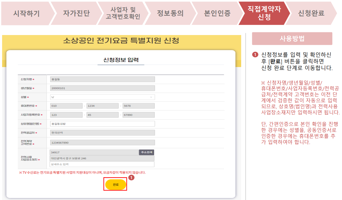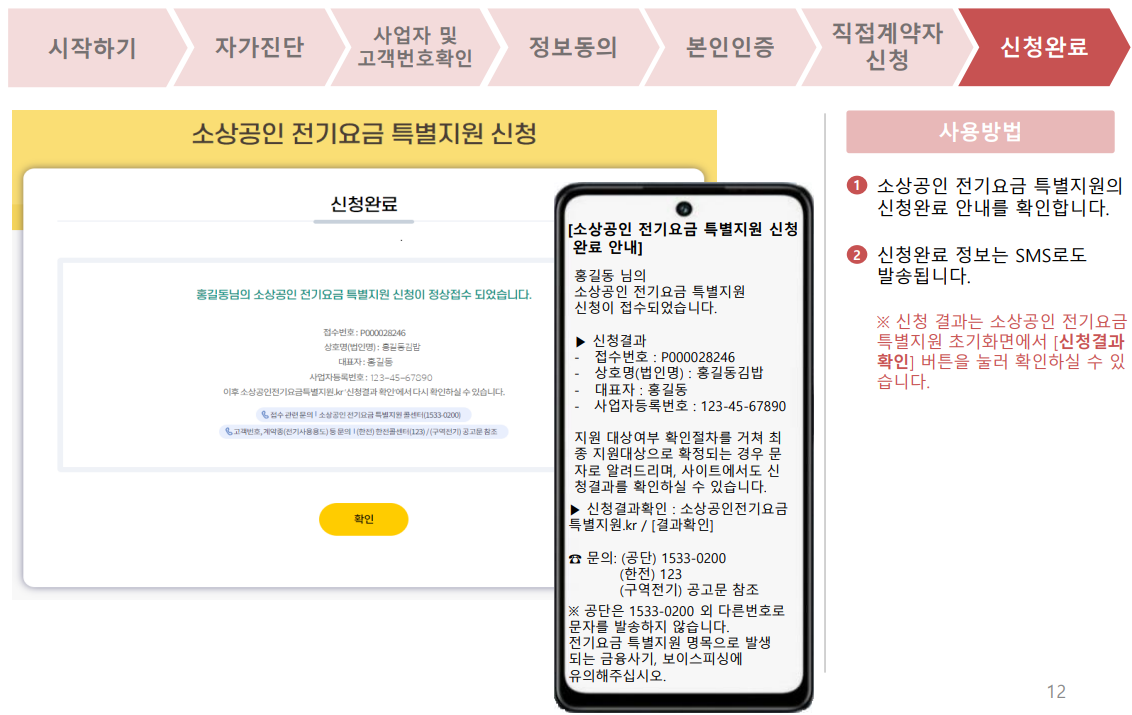 14. 소상공인 전기요금 특별지원의 신청완료 안내를 확인합니다.