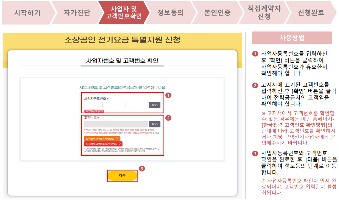 7. 사업자등록번호와 고객번호 확인을 완료한 후, 다음 버튼을 클릭하여 정보동의 단계로 이동합니다.