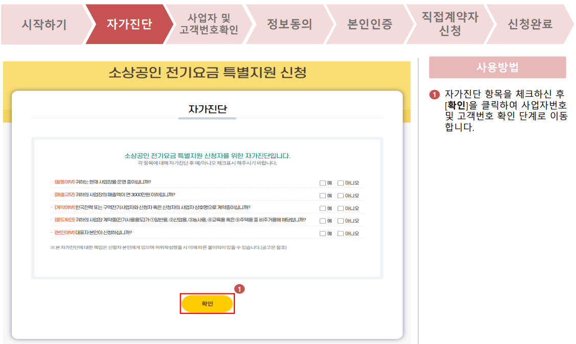 4. 자가진단 항목을 체크하신 후 확인을 클릭하여 사업자번호 및 고객번호 확인 단계로 이동합니다.