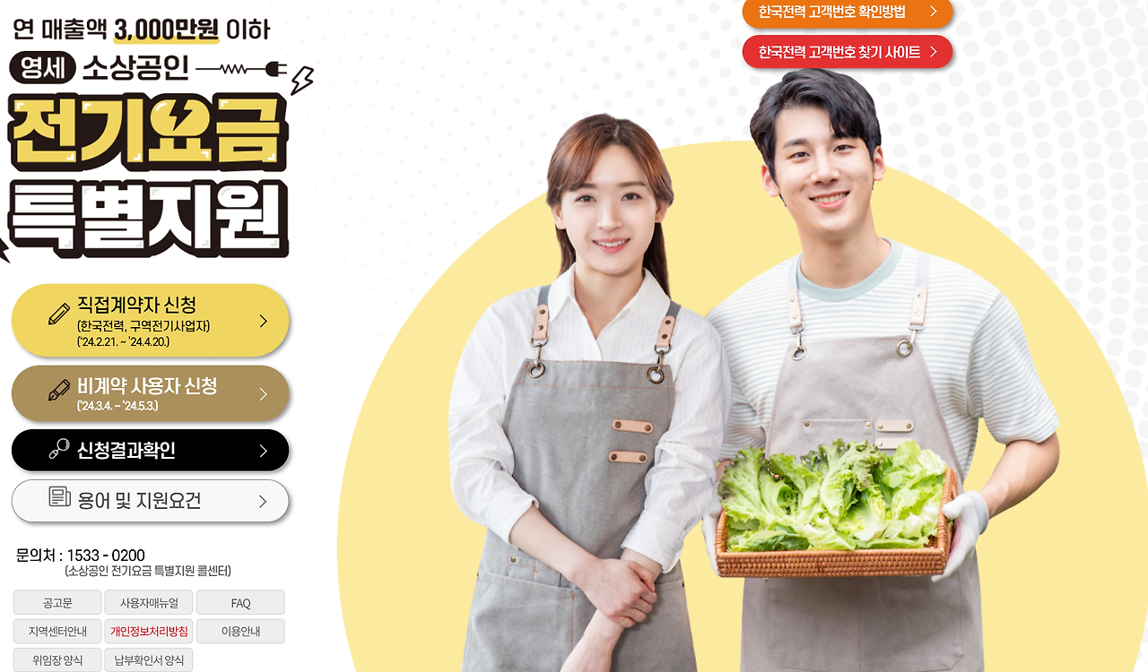 지원요건 : (활동사업자) 2023.12.31. 이전 개업, 공고일 기준 폐업상태가 아닌 개인·법인사업자 (매출액 기준) 국세청 부가세 신고매출액 또는 면세사업자 사업장현황신고 기준 연 매출액 0원 초과 ~ 3천만원 이하 사업자 (전기요금 계약종) 사업장에 부과되는 전기요금의 용도가 ①일반용,②산업용,③농사용,④교육용,⑤주택용 중 비주거용인 경우