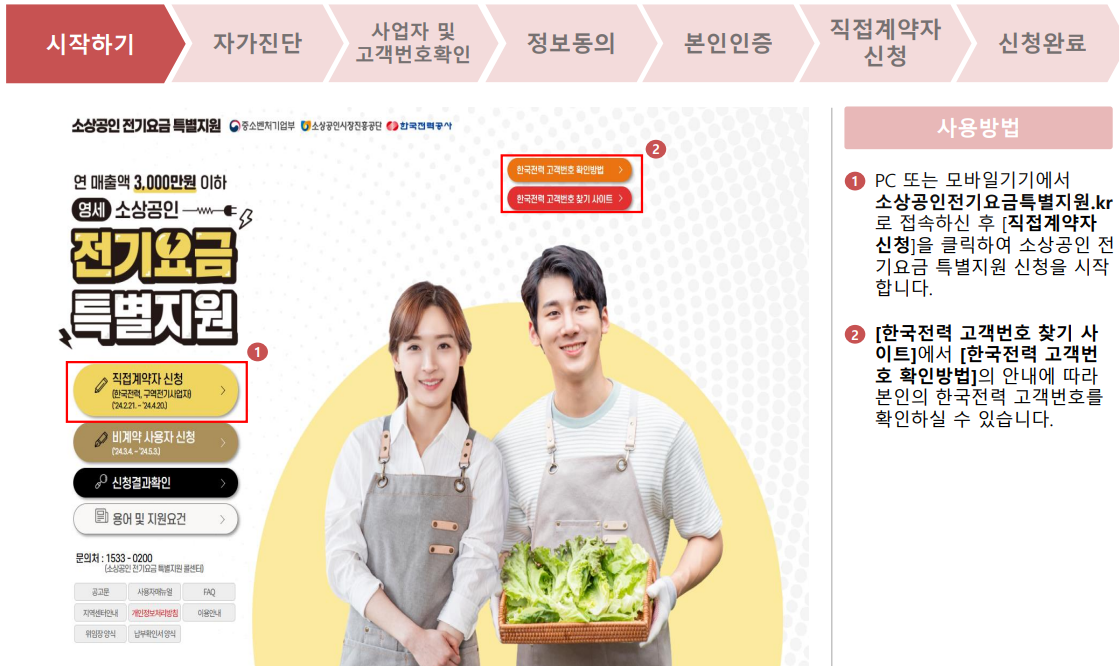 1. PC 또는 모바일기기에서 소상공인전기요금특별지원.kr로 접속하신 후 [직접계약자 신청]을 클릭하여 소상공인 전기요금 특별지원 신청을 시작합니다.