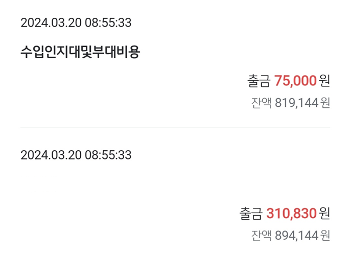 대출 승인 당일에 인지세와, 보증보험료가 빠져 나갑니다.