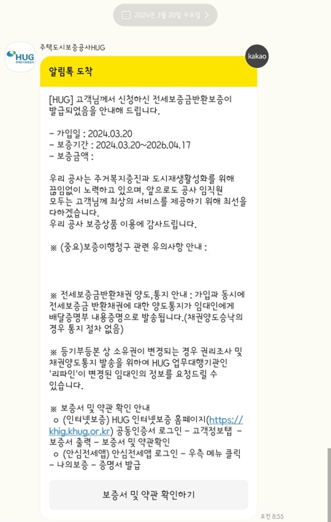 결제 후, 전세보증금반환보증이 발급되었다는 알림톡을 받으실 수 있습니다. 저는 이거 받고 나서 바로 실행이 되는 줄 알았거든요..근데 그건 아니더라구요! 보증보험 가입 후 대출신청한 은행에서도연락이 옵니다 ! 저는 국민은행에서 알림톡 받았어요 :)