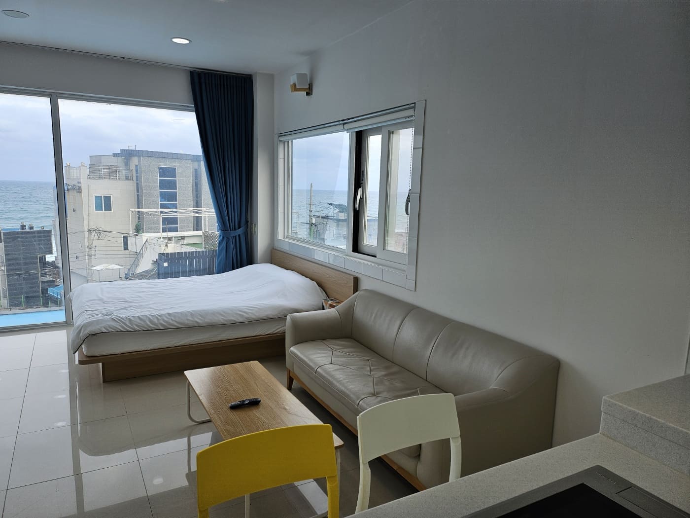 문을 열고 들어가면 제일 먼저 보이는 침대와 바다입니다 ! 깔끔하게 정리되어 있었고, 바닥도 따뜻하게 해주셔서 갑자기 추워진 날씨에 포근함을 느낄 수 있었습니다 :D!