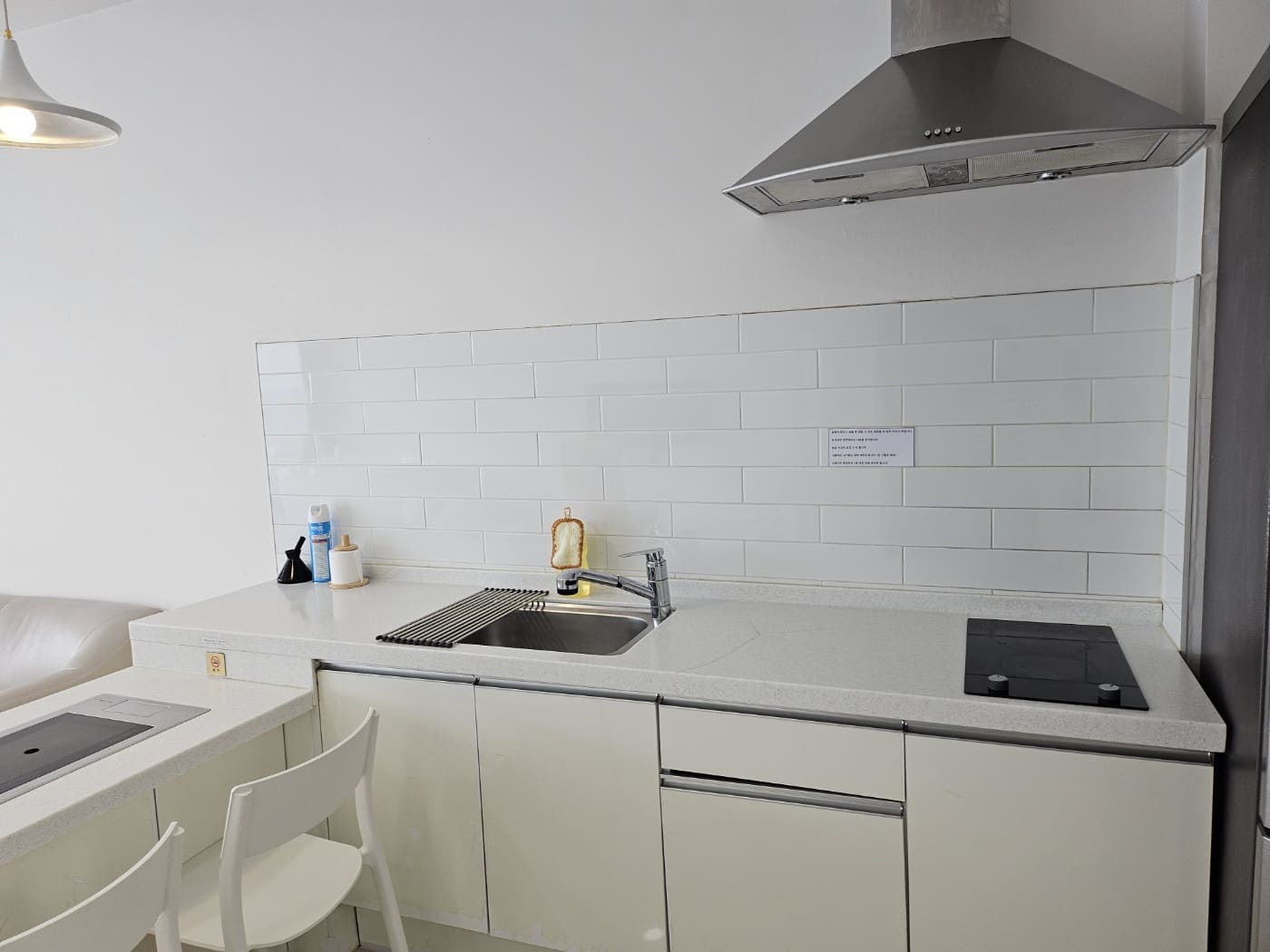 주방은 이렇게 되어 있어요, 전기그릴 이용하시려면 이용료 20,000원 있습니다 ! 저희는 따로 이용안했습니다. 숯불에 해서 먹는게 좋은데 그릴이라 조금 망설여 지더라구요..