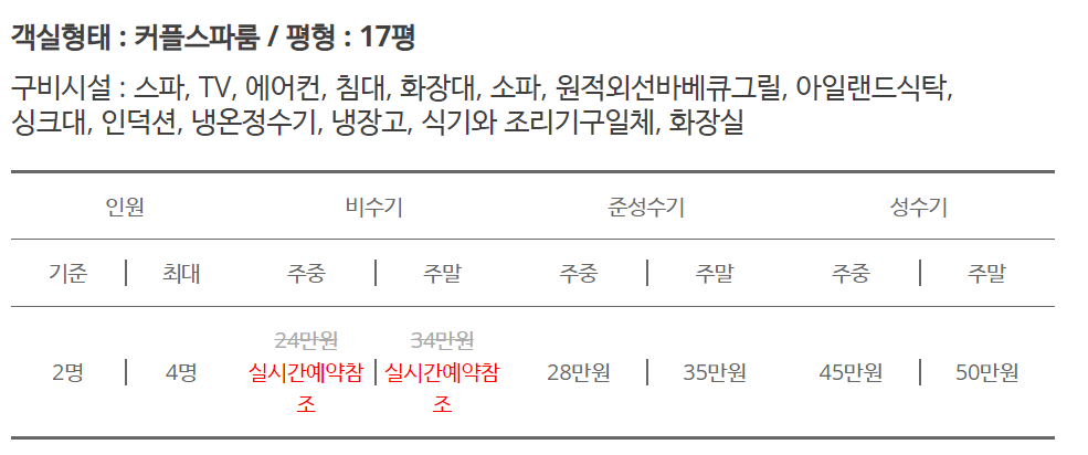 객실형태 및 금액